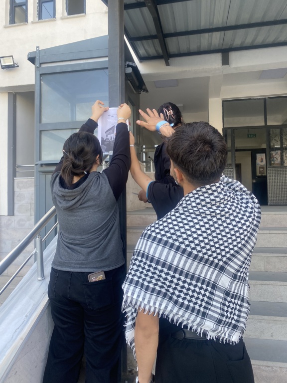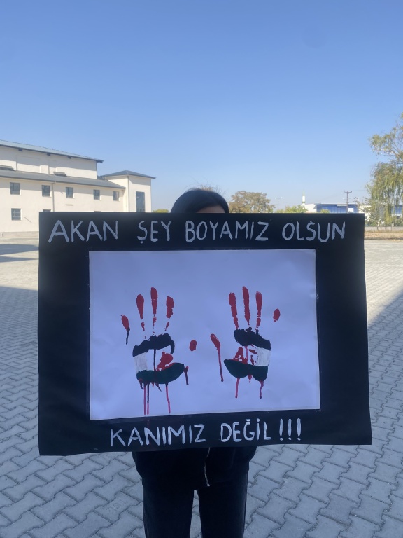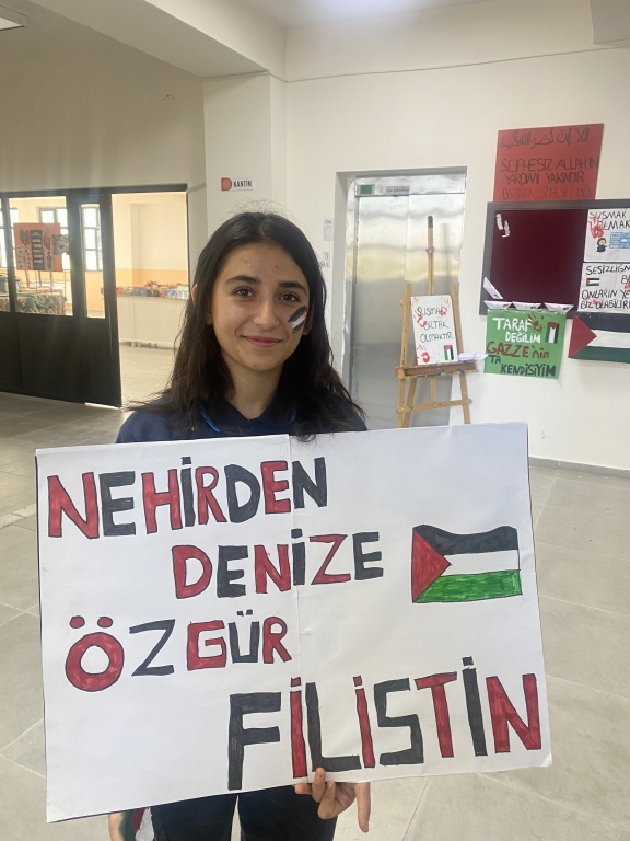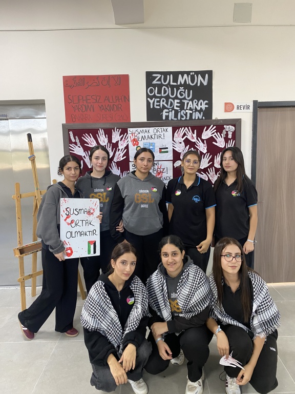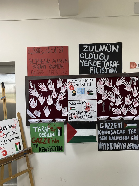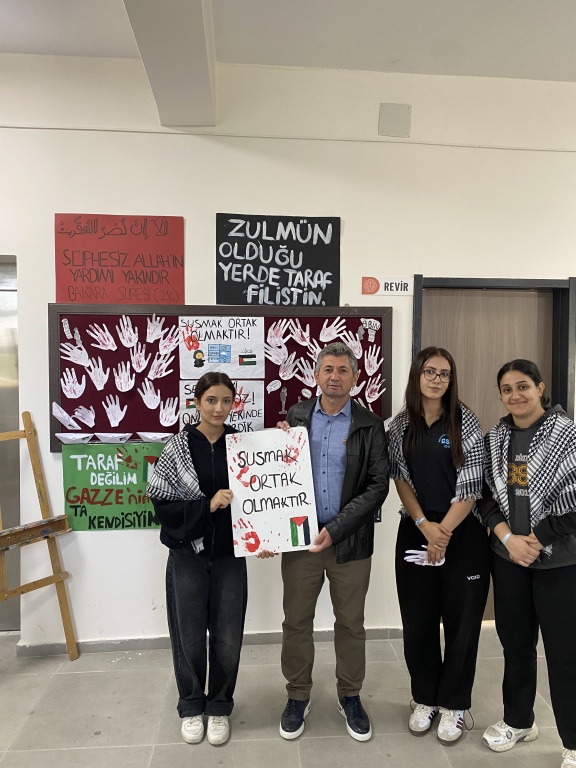 Okulumuz öğrencileri, öğretmenlerinin rehberliğinde Filistin halkına destek olmak için pankartlar hazırladı, afiş çalışmaları yaptı ve çeşitli farkındalık etkinlikleri düzenledi. Hazırlanan pankartlarda barış, kardeşlik ve insanlık vurgusu öne çıkarıldı. Etkinlik boyunca öğrenciler hem sanatsal yaratıcılıklarını sergiledi hem de vicdanı ve duyarlılığı merkeze alan güçlü mesajlar verdi.